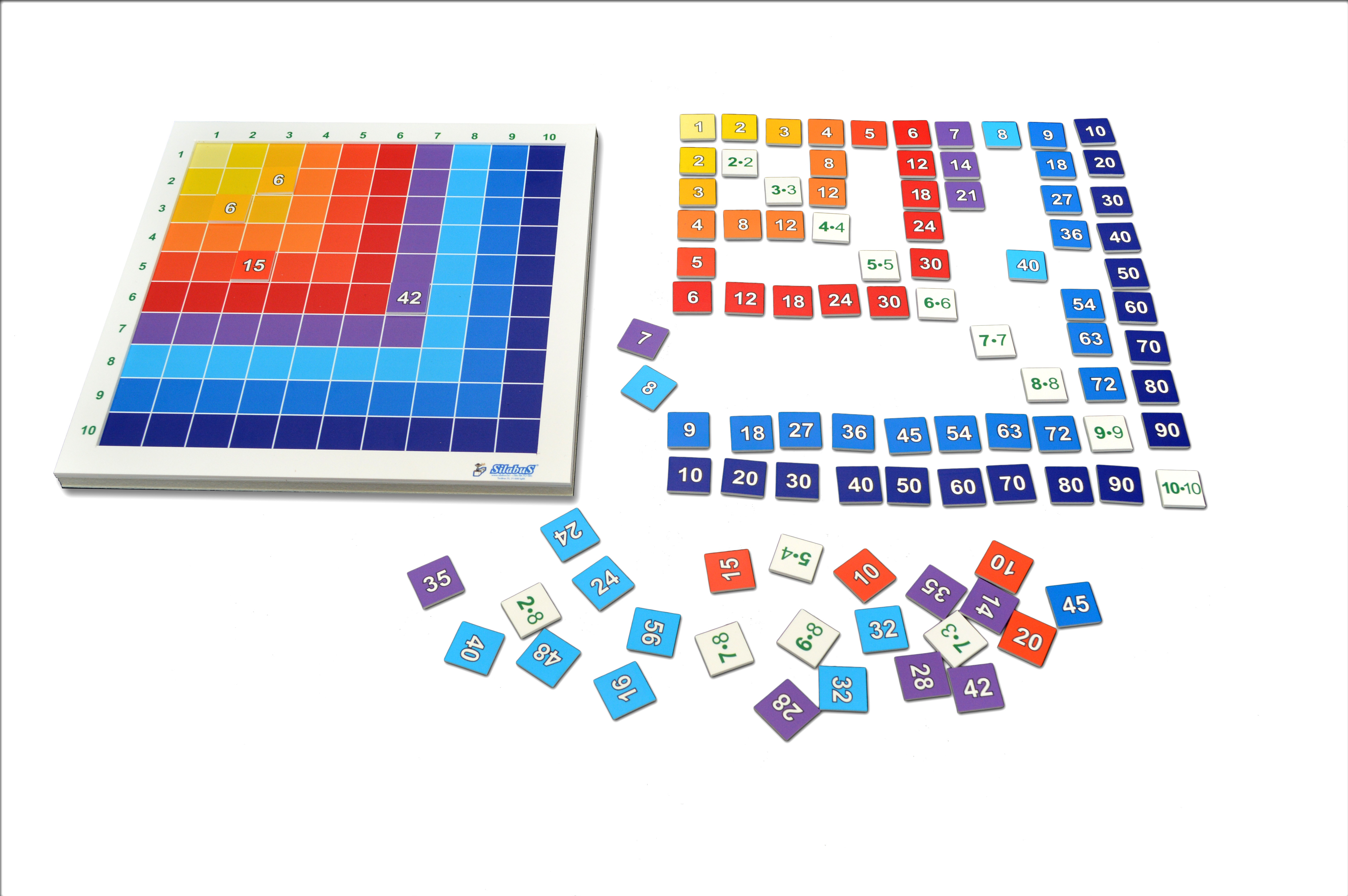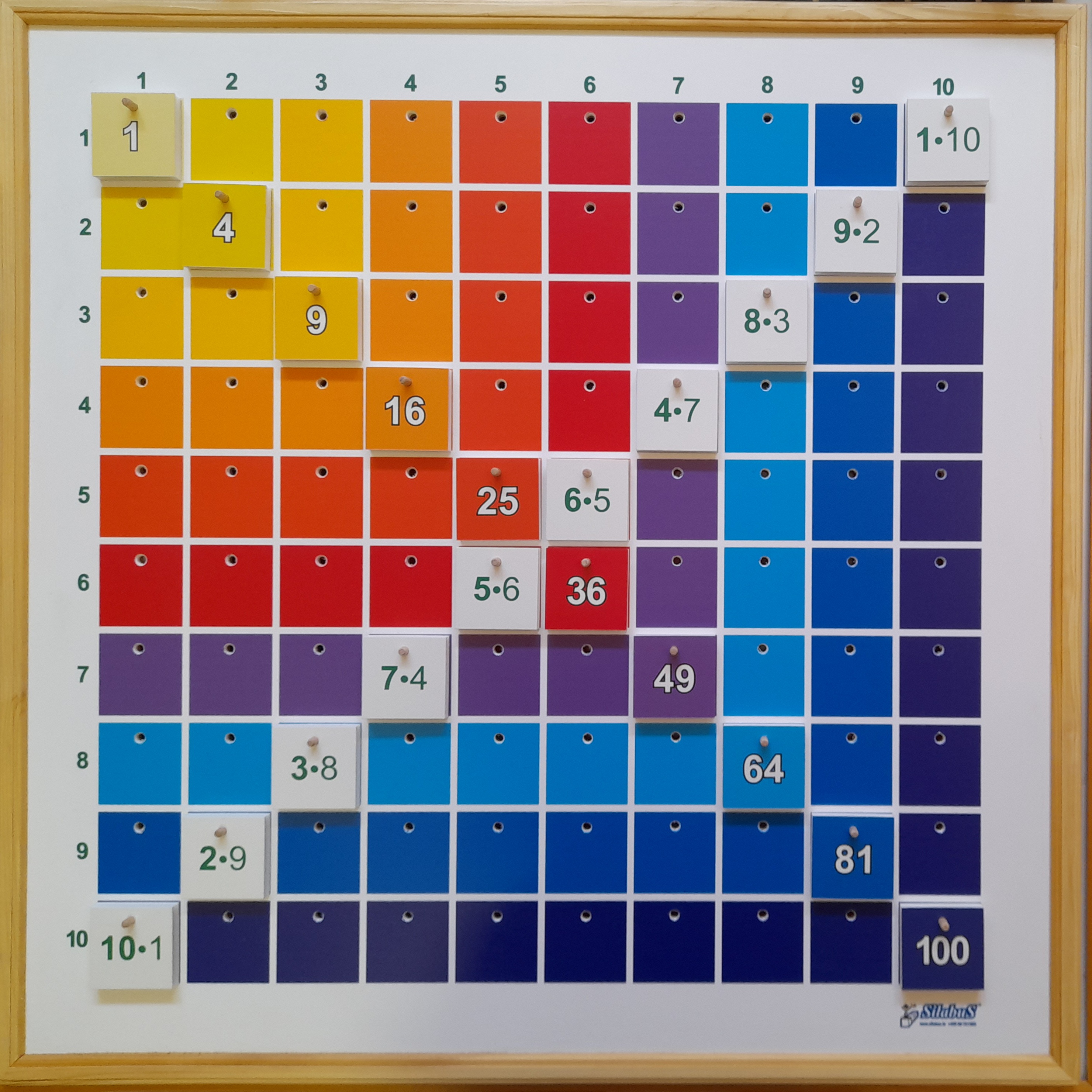 Velika ploča za slaganje u 10 boja i 100 kvadratića u bojama s umnošcima s jedne i faktorima s druge strane, za škole, vrtiće, igraonice i za kućnu uporabu. Dimenzije: 80cmx80cmx1cm Materijal: Acca Foam s drvenim okvirom