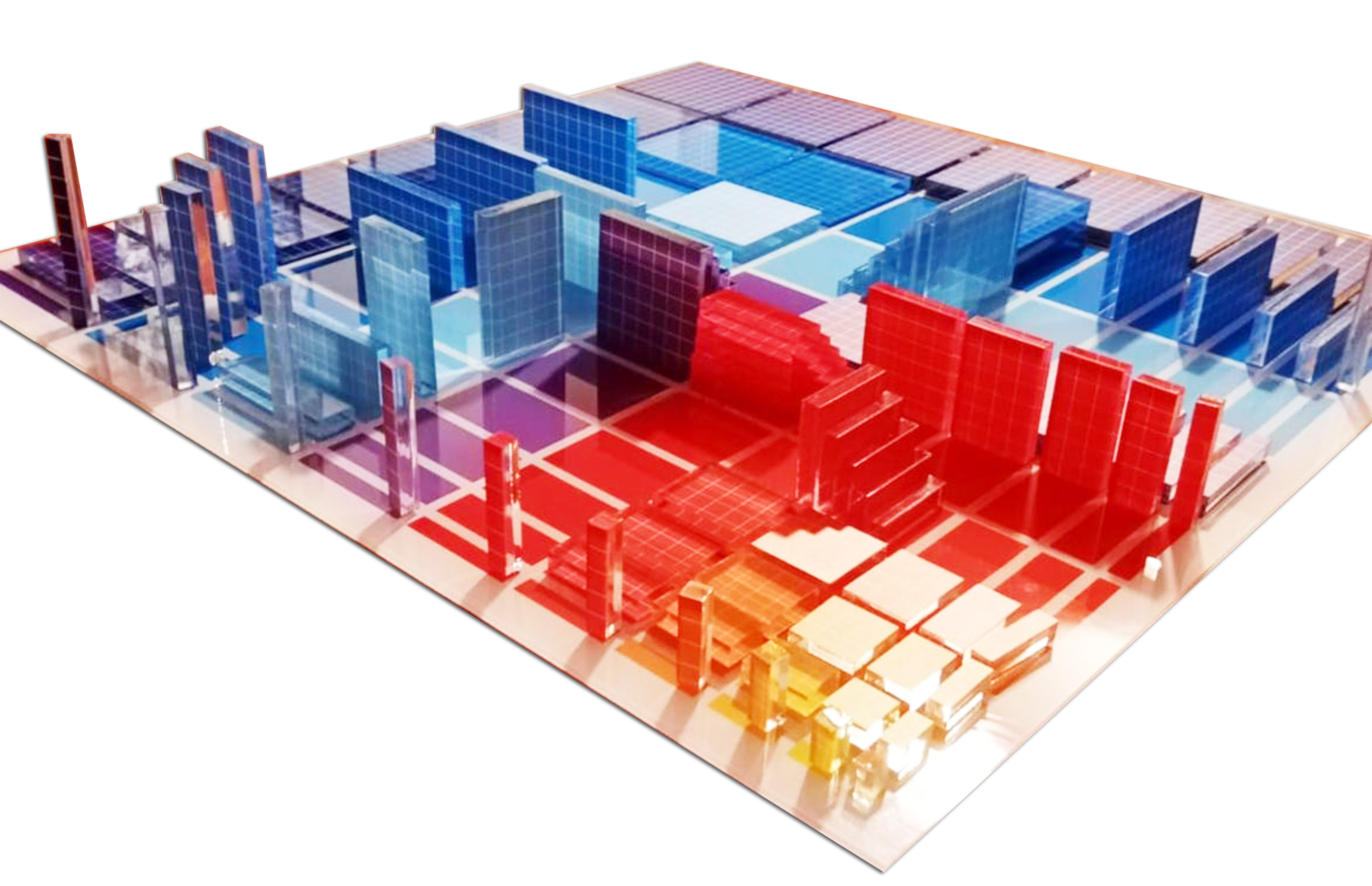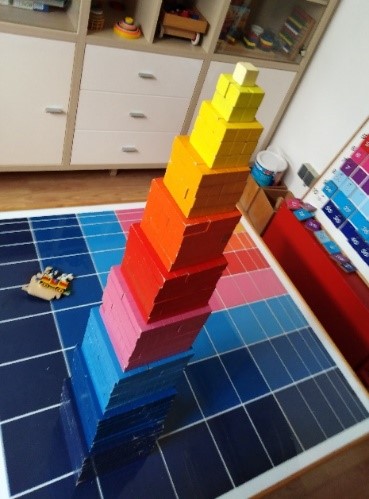 Ploča za slaganje u 10 boja sa 100 prizmi (kockica) različitih veličina u bojama, za škole, vrtiće, igraonice i za kućnu uporabu. Dimenzije ploče: 100cmx100cm Dimentije prizmi: debljina 1.6cm